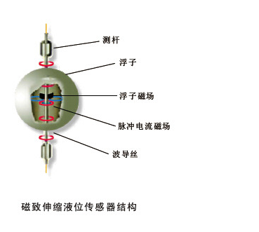 传感器工作时,电路部分将在波导丝上激励出脉冲电流,该电流沿波导丝传播时会在波导丝的周围产生脉冲电磁场。在传感器测杆外配有一浮子,此浮子可沿测杆随液位的变化而上下移动。在浮子内部有一组永久磁环。当脉冲电流磁场与浮子产生的磁环磁场相遇时,浮子周围的磁场发生改变从而使得由磁致伸缩材料做成的波导丝在浮子所在的位置产生一个扭转波脉冲,这个脉冲以固定的速度沿波导丝传回并由检出机构检出。通过测量脉冲电流与扭转波的时间差可以精确地确定浮子所在的位置,即液面的位置。